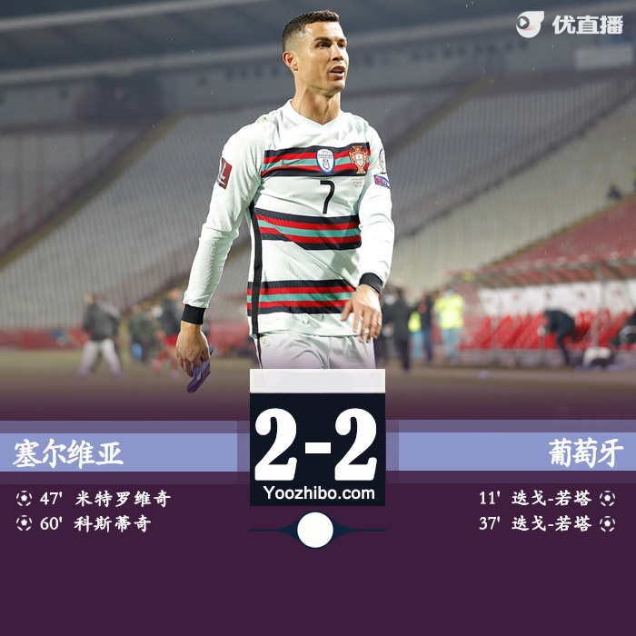 24直播网3月28日讯 北京时间3月28日凌晨3点45分,世预赛欧洲赛区A组第2轮展开角逐,葡萄牙客场挑战塞尔维亚。上半场若塔头球梅开二度,下半场米特洛维奇和科斯蒂奇扳平比分,米伦科维奇补时染红,C罗绝杀球遇门线悬案。最终葡萄牙客场2-2战平塞尔维亚,A组积分榜方面,塞尔维亚积4分位居榜首,葡萄牙积4分仍居第2名。