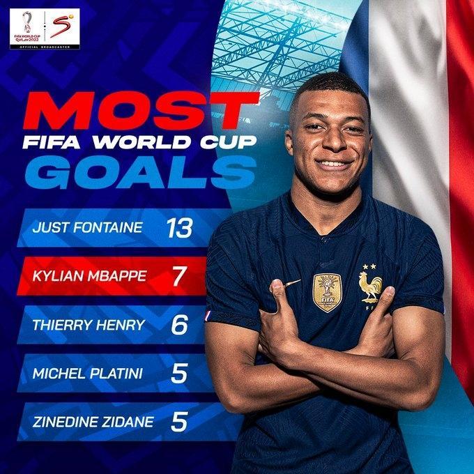 1、姆巴佩世界杯已打入7球,超过6球的亨利,在法国队史世界杯射手榜中仅次13球的方丹