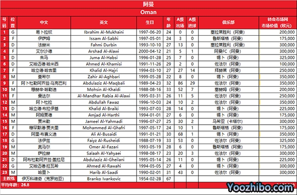 来源:24直播网08-01 20:0524直播网讯 阿曼男足成立于1978年,于2004年第一次打进亚洲杯决赛圈,曾两度夺得海湾杯足球赛冠军。那么阿曼队征战此次世预赛的阵容是怎么样的呢,接下来就随小编一起来了解一下吧。