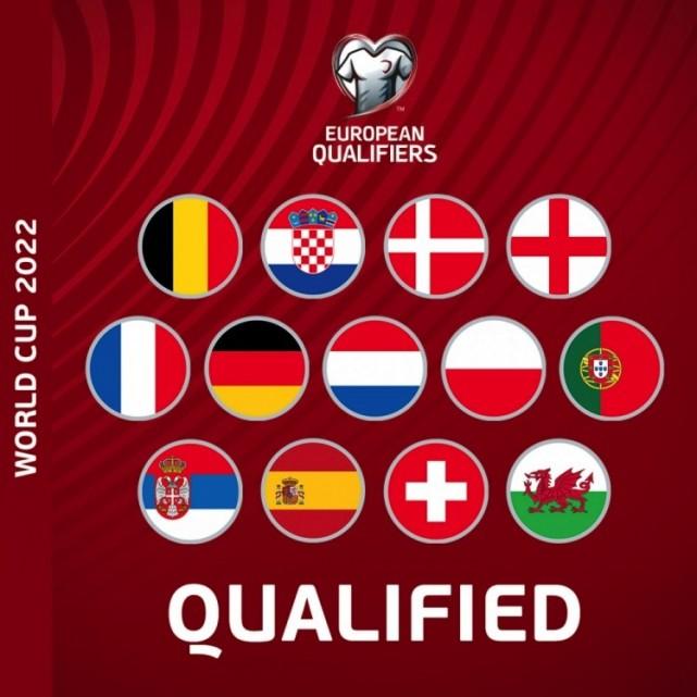 自此,世界杯欧洲区的13支出线队全部出炉。分别为:荷兰(A4)、英格兰(B1)、威尔士(B4)、波兰(C4)、法国(D1)、丹麦(D3)、西班牙(E1)、德国(E3)、比利时(F1)、克罗地亚(F4)、塞尔维亚(G2)、瑞士(G3)、葡萄牙(H1)。其中葡萄牙、波兰和威尔士是通过附加赛拿到世界杯门票。