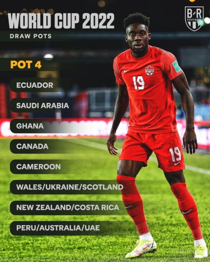 第四档:加拿大、喀麦隆、厄瓜多尔、沙特、加纳和3支洲际附加赛获胜队伍