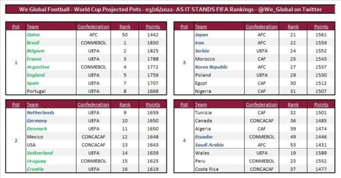 24直播网03月27日讯 北京时间4月2号凌晨,将会举行世界杯抽签仪式,据数据网站计算,目前已经有7队确认为一档球队。