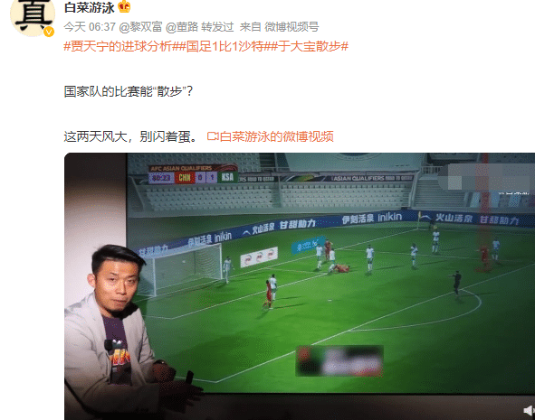 来源:24直播网03-26 16:1524直播网03月27日讯 在国足1-1战平沙特的比赛中,于大宝在一次进攻中出现“散步”的情况,在球权转换之后,也没有第一时间回防,这让很多解说员和网友都比较不满。不过也有另外一种声音认为,于大宝不需要往前跑,他要做“保护性接应”。