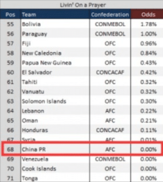 外媒:中国晋级卡塔尔世界杯的概率为0.00%