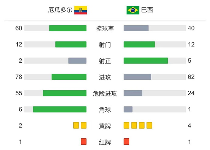 巴西1-1厄瓜多尔 阿利森2次染红均取消埃莫森染红