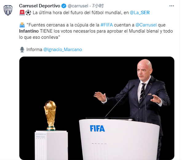 塞尔电台报道,接近国际足联的消息人士称,因凡蒂诺获得了批准两年一届世界杯及所有相关事宜的选票支持。