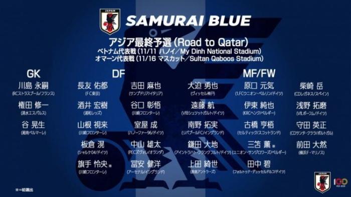 来源:24直播网11-04 15:5824直播网11月03日讯 国足12强赛对手,日本国家队今日公布了12强赛的大名单,其中三笘薫和旗手怜央首次入选。日本队将在本月11日和16日先后迎战越南、阿曼。