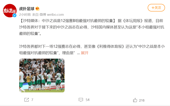 沙特媒体《利雅得体育报》甚至认为这是“本小组最强对抗最弱的较量”。理由是“沙特队3轮打入5球,攻击力稍逊澳大利亚2球排名小组第二,而中国队已经丢掉6球,是仅次于越南队的第二弱防线。”说实话,人家这么说我们也没法反驳,的确对方实力强于我们,最好的回应还是在赛场上,如果国足击败沙特,那无疑会极大地提升士气!