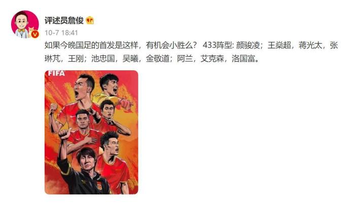詹俊写道:“如果今晚国足的首发是这样,有机会小胜么?433阵型:颜骏凌;王燊超,蒋光太,张琳芃,王刚;池忠国,吴曦,金敬道;阿兰,艾克森,洛国富。”