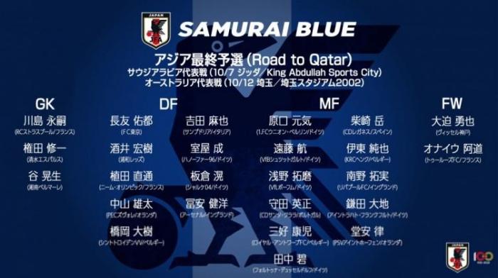 中场:原口元气(柏林联合)、柴崎岳(莱加内斯)、远藤航(斯图加特)、伊东纯也(亨克)、浅野拓磨(波琴)、南野拓实(利物浦)、守田英正(圣克拉拉)、镰田大地(法兰克福)、三好康儿(皇家安特卫普)、堂安律(埃因霍温)、田中碧(杜塞尔多夫)
