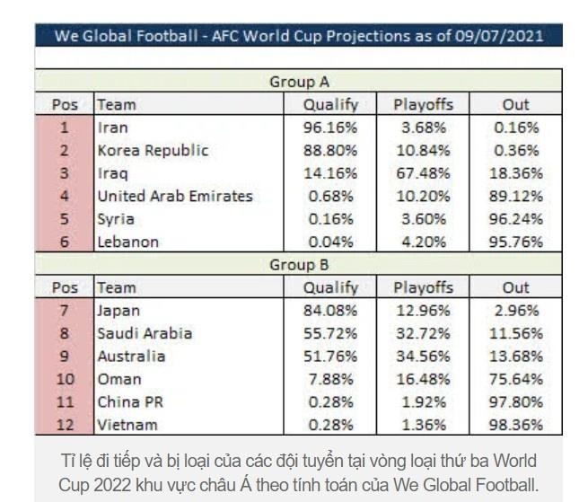 从公布的数据来看,第一组中伊朗和韩国分别是晋级的头号种子和二号种子,晋级概率高达96.16%和88.80%,最差的是黎巴嫩,他们进入世界杯的概率仅为0.04%,也是12强中被看成是最弱的球队!第二小组中头号种子是日本队,晋级概率高达84.08%,二号种子是沙特,然后是澳大利亚的51.76%!