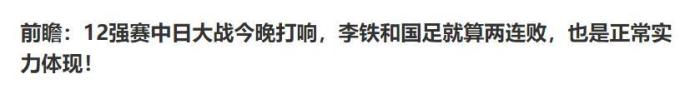 中日大战固然精彩,但归根结底也就是一场比赛,也就是3分。国足是小组第四档球队,实力和第一档日本队、第二档的澳大利亚队存在客观差距,输球是正常,赢球是意外。