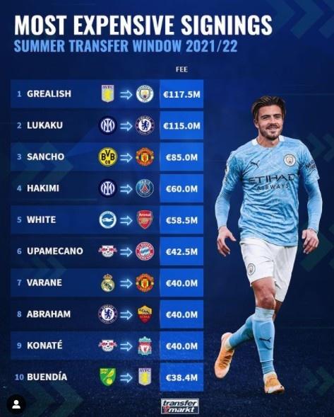 24直播网9月02日讯 ,足球转会市场网盘点了今年夏窗的转会费前十,格拉利什成为了今夏的标王,英超独占前十中的七个席位。