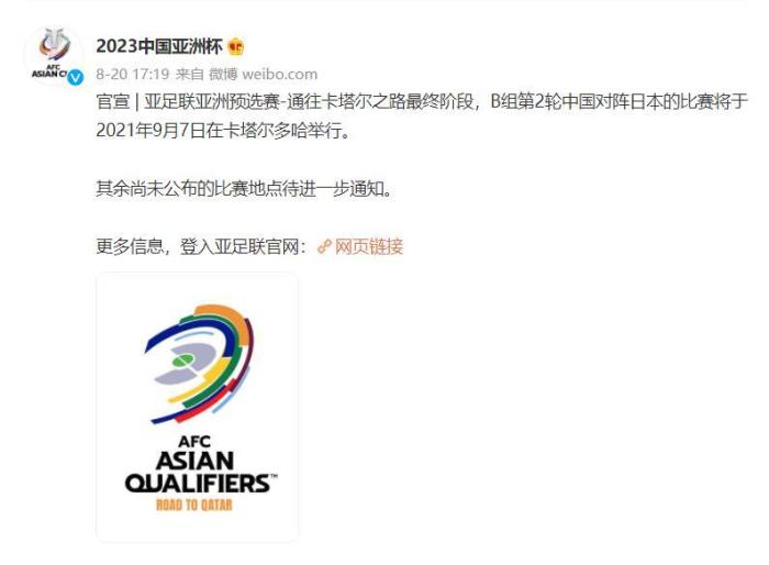 来源:24直播网08-21 09:5524直播网讯 今日,亚足联官宣,B组第2轮中国对阵日本的比赛将于2021年9月7日在卡塔尔多哈举行。