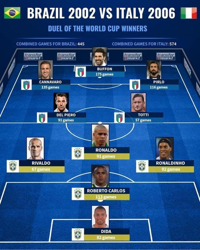 来源:24直播网03-28 15:3724直播网2月28日讯 德转今日发布了2002世界杯冠军巴西与2006世界杯冠军意大利的一套五人制阵容对决,并写道:谁能胜出?