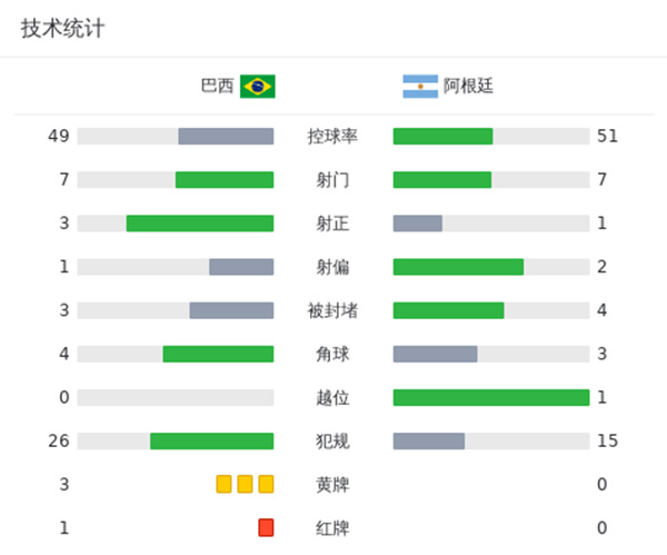 来源:24直播网11-22 11:11 24直播网讯 :北京时间11月22日08:55,世预赛南美区第6轮焦点战,巴西坐镇主场马拉卡纳球场迎战阿根廷,本场主裁判为彼罗-马萨。赛前,看台上球迷爆发激烈冲突,比赛推迟近半个小时。上半场,双方火药味十足,犯规、冲突不断;罗梅罗门线救险挡出了马丁内利的威胁攻门。下半场,马丁内利错失良机,奥塔门迪泰山压顶头槌制胜,梅西伤退,乔林顿被直红罚下。最终,阿根廷客场1-0送巴西3连败。