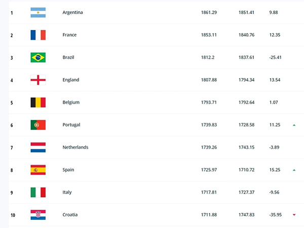 前10名中,前5位位次没有变化,葡萄牙凭借欧预赛出色发挥升到了第6位,西班牙升到第8位,而表现欠佳的克罗地亚则跌至第10位。