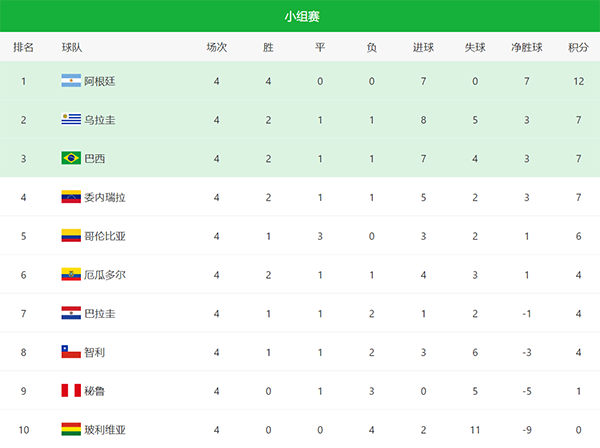 阿根廷队稳居第一,作为世界杯冠军的他们在梅西的带领下开局4连胜,本轮更是客场击败秘鲁,梅西获得了主场一般的待遇,而他也用连续进球,帮助阿根廷队取得胜利。这样阿根廷队4场比赛全胜,拿下12分,稳居第一名。