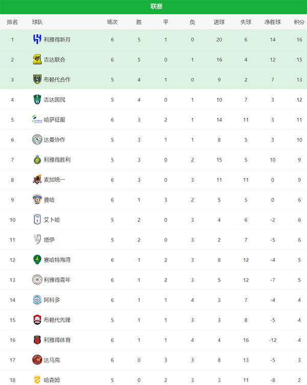 拥有菲尔米诺、门迪和凯西等人的吉达国民少赛一场落后榜首球队4分,吉达国民一度领跑联赛,但后期1-5不敌哈萨征服,吃到首败,目前的战绩为4胜1负,如果强势反弹的话,依旧可以冲击给榜首球队带来巨大的冲击。