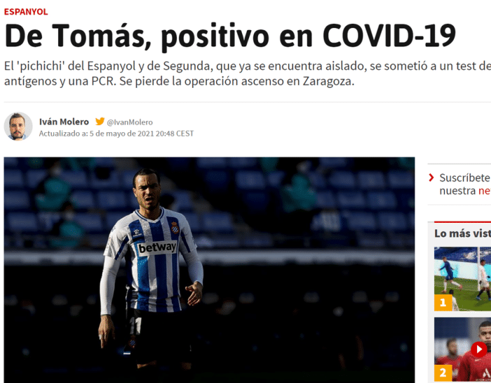 西班牙人证实队内出现新冠病例, 德托马斯自宣中招