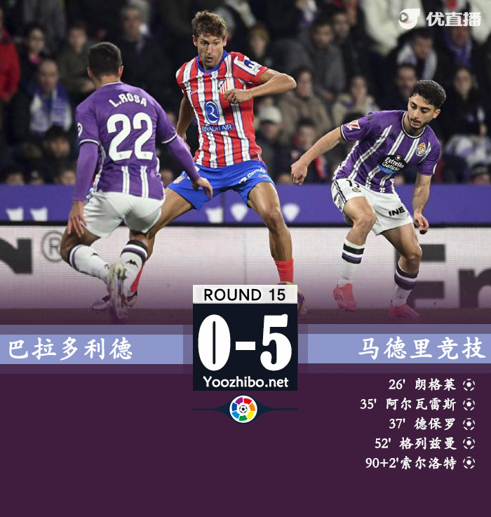 来源:24直播网12-01 06:26 24直播网讯 北京时间12月1日西班牙足球甲级联赛第15轮的较量中,巴拉多利德坐镇主场迎战马德里竞技。上半场,略伦特助攻,朗格莱破门。格列兹曼射门被扑出,阿尔瓦雷斯补射建功。哈维-加兰传球,德保罗冷静推射得手。下半场,阿尔瓦雷斯传球,格列兹曼华丽转身破门。终场前,科雷亚助攻,瑟洛特轻松推射空门得手。全场比赛结束,马竞5-0大胜巴拉多利德,各项赛事豪取7连胜。