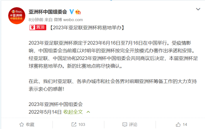 来源:24直播网05-15 16:1524直播网05月15日讯 消息,2023年亚洲杯组委会官方宣布,因为疫情影响,2023年亚洲杯将易地举办,新的举办地点有待确认。对于中国足球来说,这是一个遗憾,毕竟时隔19年,原本中国男足可以在家门口再次出战亚洲杯,但是受到各方面因素影响,亚洲杯将无法在中国举办。