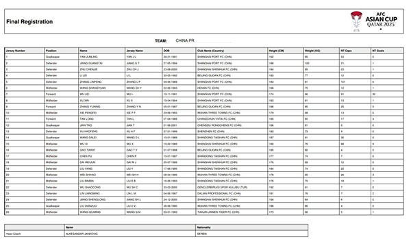 来源:24直播网01-04 18:0524直播网01月04日讯 ,亚足联官网更新了国足报名亚洲杯大名单,武磊、韦世豪在列,此前热身赛受伤的队长吴曦依旧在列,归化前锋艾克森落选。由于国足此前集训名单就为26人,因此这26人实际上就是亚洲杯国足26人参赛名单。唯一变动的便是归化中场李可中途离队,海港后腰徐新紧急驰援。