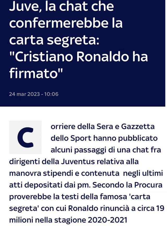 被曝光的聊天记录,来自一个叫“第二次薪资调整”的群组。该聊天记录显示,2021年4月23日下午1:42分,尤文秘书Paolo Morganti在群组中回复:“克里斯蒂亚诺已经签字”,一分钟后又补充道:“他得到了所有文件的副本。” 随后尤文体育总监凯鲁比尼回复:“好!”