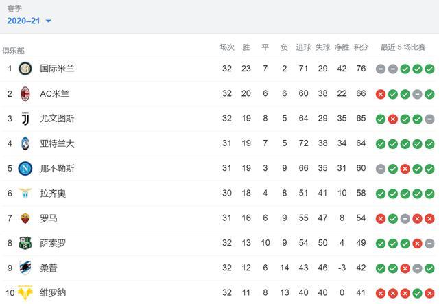 国米目前32轮76分排名第一,米兰32轮66分排名第二,尤文图斯32轮65分排名第三,亚特兰大少赛一轮落后尤文1分,64分排名第四。