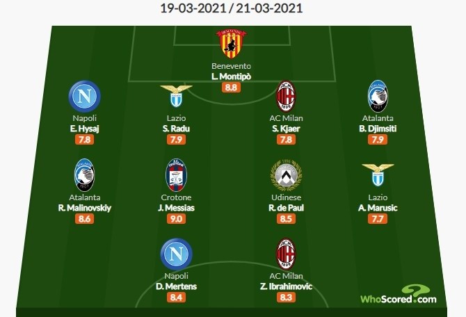 Whoscored意甲28轮最佳阵:伊布领衔 克亚尔、默滕斯在列
