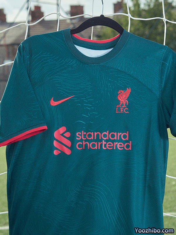 利物浦2022/23赛季第二客场球衣球员版与球迷版均使用100% 再生涤纶面料制成,该面料由再生塑料瓶制成。