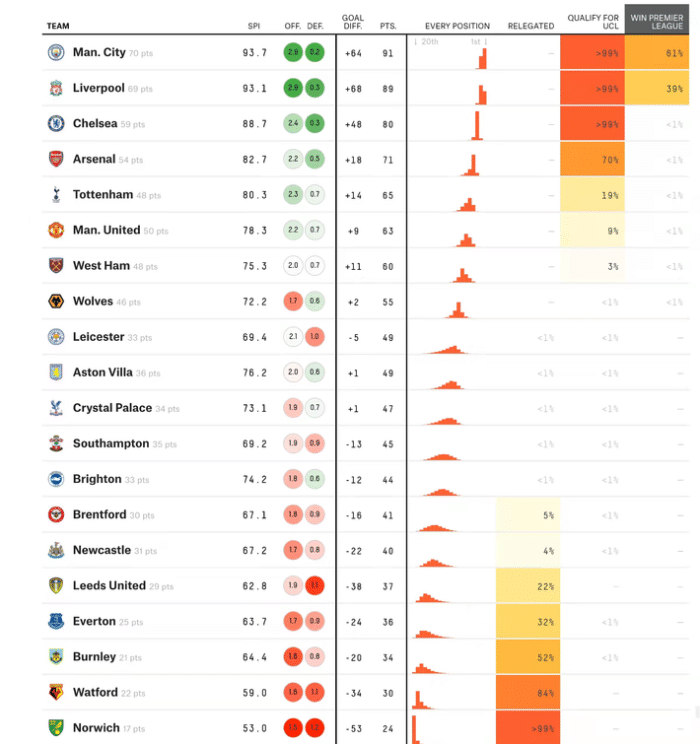 24直播网03月20日讯 消息,大数据机构fivethirtyeight更新了本赛季英超的模拟结果,曼城有61%的概率夺冠,阿森纳有70%的概率进前四。