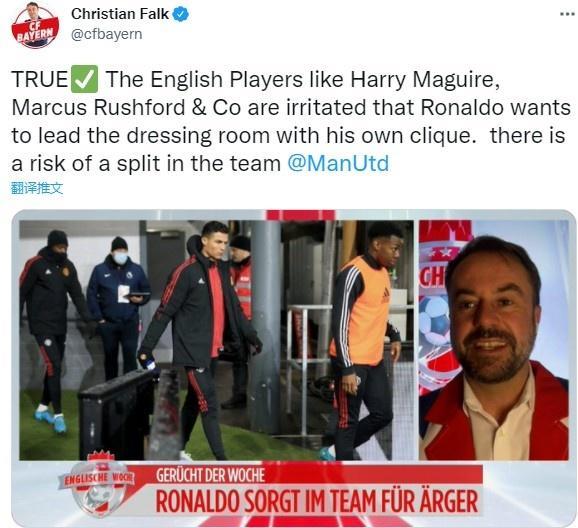 法尔克表示:“在曼联内部,包括马奎尔和拉什福德在内的英格兰球员对于C罗想用自己的小圈子领导更衣室感到恼火,球队现在面临着分裂的风险。”