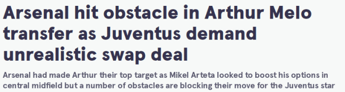 意天空表示,阿森纳引进阿图尔的交易遇到障碍,因为尤文提出了不现实的要求,他们希望阿森纳能把托马斯-帕尔特伊加入到交易中,这让阿森纳无法接受。