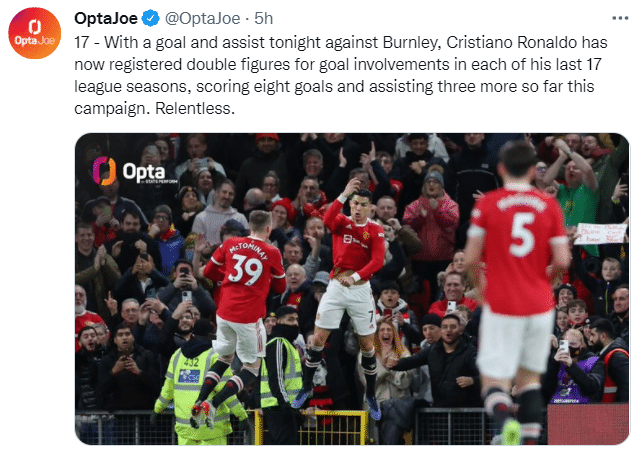 今天凌晨,曼联在英超联赛中3-1击败伯恩利,C罗贡献一球一助,本赛季他在英超联赛已为曼联打进8球并送出3个助攻,共造11球。