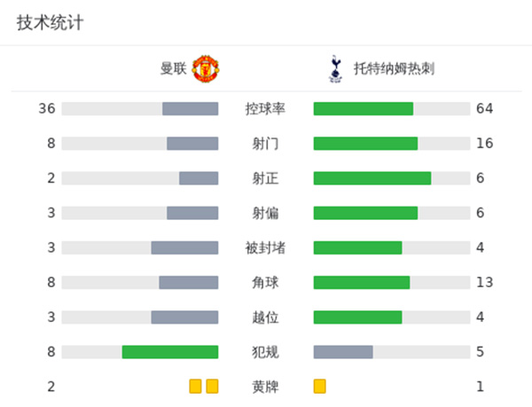 第3分钟,曼联反击,拉什福德得球后在禁区内横向带球被断,霍伊伦直接迎球左脚怒射,皮球直挂死角,曼联闪击破门,打破僵局,曼联1-0热刺!
