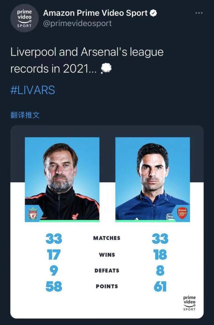 根据该媒体的统计,双方在2021年均进行了33场联赛,其中克洛普取得17胜7平9分,共拿到58分;阿尔特塔取得18胜7平8负,共拿到61分。
