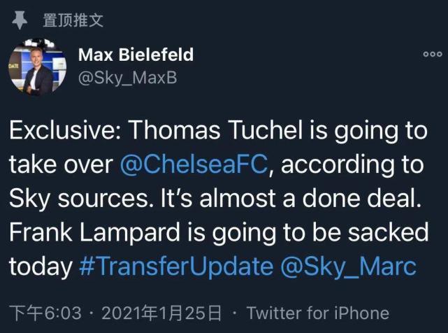 Max Bielefeld透露,图赫尔执教切尔西基本已敲定,这位47岁的德国名帅已经接受了邀请,他将会与切尔西签约至2022年,双方将会在未来数小时内签约。另外兰帕德下课的消息,也将在24小时内官方宣布。