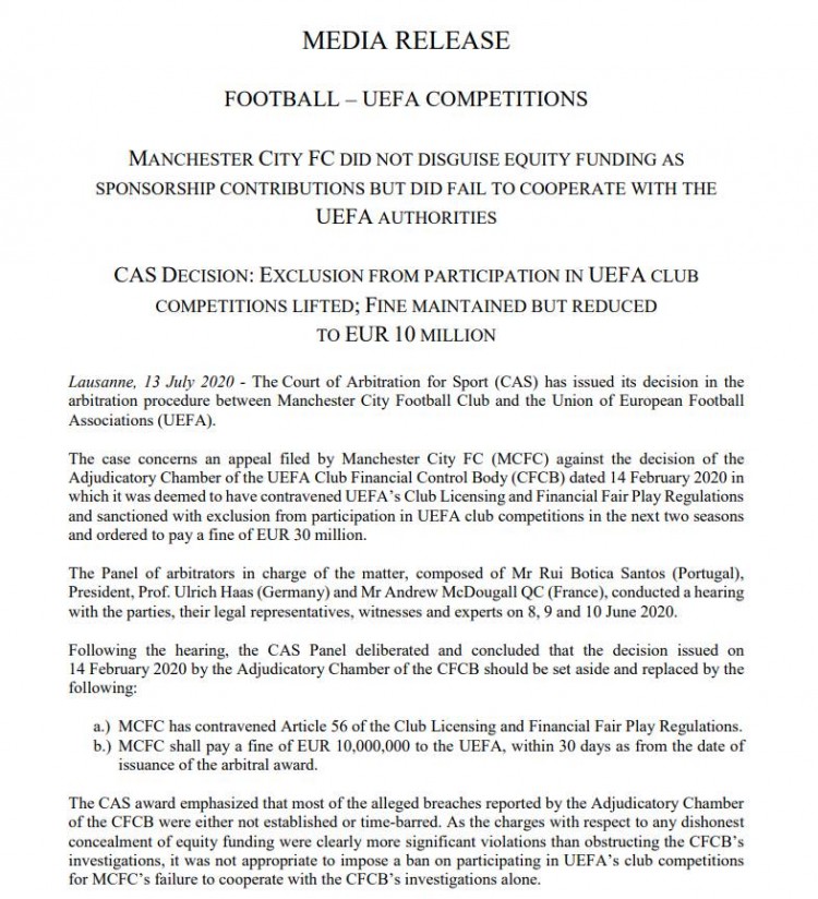欧足联注意到,国际体育仲裁法庭做出决定,减少了欧足联独立的俱乐部财务控制机构CFCB对曼城俱乐部的制裁,制裁原因是他们涉嫌违反了欧足联俱乐部许可和财务公平竞赛规定。