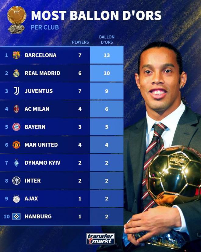 24直播网讯德国转会市场统计了各俱乐部球员获得金球的数量,并列出榜单,巴萨以13座金球居首,皇马10座金球次席。