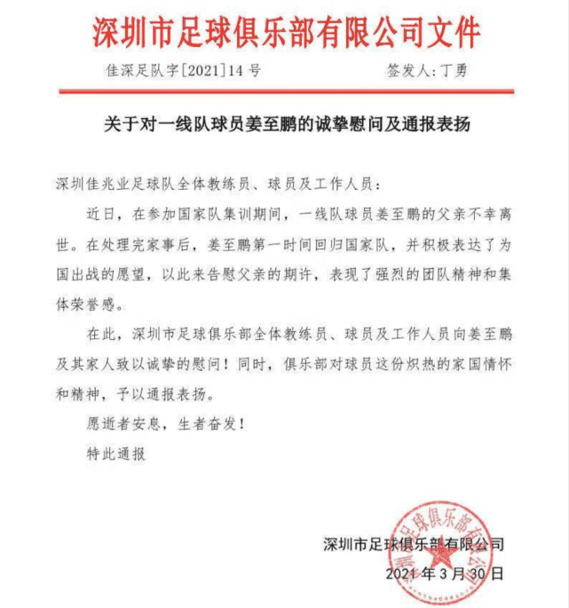 原来,在3月28日姜至鹏收到了噩耗,他的父亲突然去世。在办完父亲后事之后,姜至鹏请假两天就从青岛马上赶回国家队。并且,他还有强烈的比赛愿望,在替补于大宝登场之后被戴上了队长袖标。李铁表示自己十分感动,对于拥有这样的国脚感到骄傲,有这样的团队而感到自豪。随后,中国男足官方转发了李铁的内容,并且表示:“我们把这场比赛的胜利献给姜至鹏的父亲!逝者安息,生者奋发”。很快,姜至鹏所属的俱乐部深圳佳兆业也发文,对他进行诚挚慰问及通报表扬。特别是对于,姜至鹏在处理完家事后第一时间回归国家队,并积极表达了为国出战的愿望,以此来告慰父亲的期许。深圳佳兆业认为姜至鹏,表现了强烈的团队精神和集体荣誉感。
