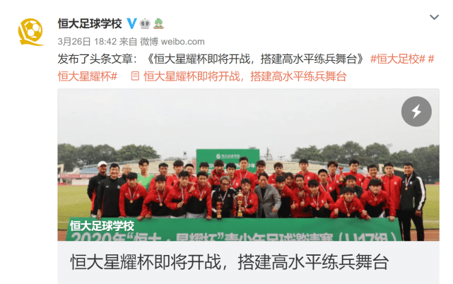 其实,恒大足球就曾经创办过南粤杯、“恒大杯”国际足球冠军赛、“恒大杯”马德里足球冠军赛,以及“恒大·星耀杯”部分年龄阶段的比赛。目的就是让中国年轻球员,可以获得更多的高水平的足球舞台展现自己的能力。进入2021年,“恒大·星耀杯”继续开打,涵盖了U13、U14、U15和U16四级年龄段的比赛,成功吸引了深圳佳兆业、上海根宝足球基地和富力足校等球队参加。好消息就是,恒大足球学校官方账号还会对部分场次进行直播,喜欢看青少年足球比赛的球迷就有福了。