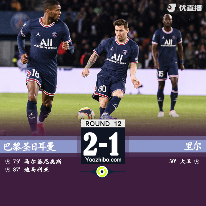 24直播网10月30日讯 北京时间10月30日凌晨3:00,2021-22赛季法甲联赛第12轮,巴黎圣日耳曼坐镇主场迎战里尔。上半场乔纳森-大卫为里尔破门,半场休息梅西被换下伊卡尔迪登场,接着迪马利亚助攻马尔基尼奥斯为巴黎扳平比分,随后迪马利亚接内马尔传球自己取得进球,最终巴黎圣日耳曼2-1逆转里尔。