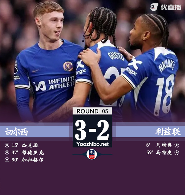 24直播网讯 北京时间2月29日 足总杯1/8决赛,切尔西主场迎战利兹联。上半场,凯塞多停球失误被断,马特奥破门,杰克逊扳平比分,穆德里克进球将比分反超!半场战罢,切尔西暂2-1利兹联;下半场,马特奥梅开二度将比分扳平,比赛最后时刻,恩佐助攻加拉格尔上演绝杀!全场比赛结束,切尔西3-2利兹联晋级8强,下一轮将对阵莱斯特城!